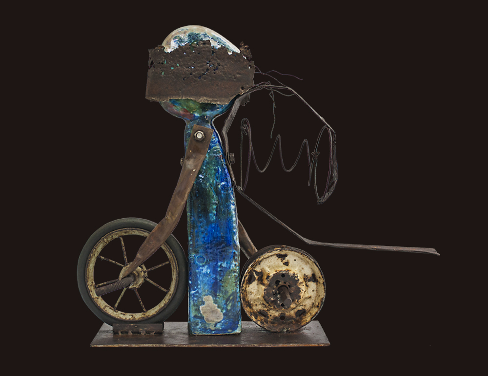 “In my sculptures I combine apparently incompatible materials—colorful ceramics and rusty sheets of metal, twisted pipes, wood from old lamp posts or wheels from unknown mechanisms. All those rejected and ruined objects, far from being at odds with the bright finish of the ceramics, evolve toward new meanings and a greater expressive force.”