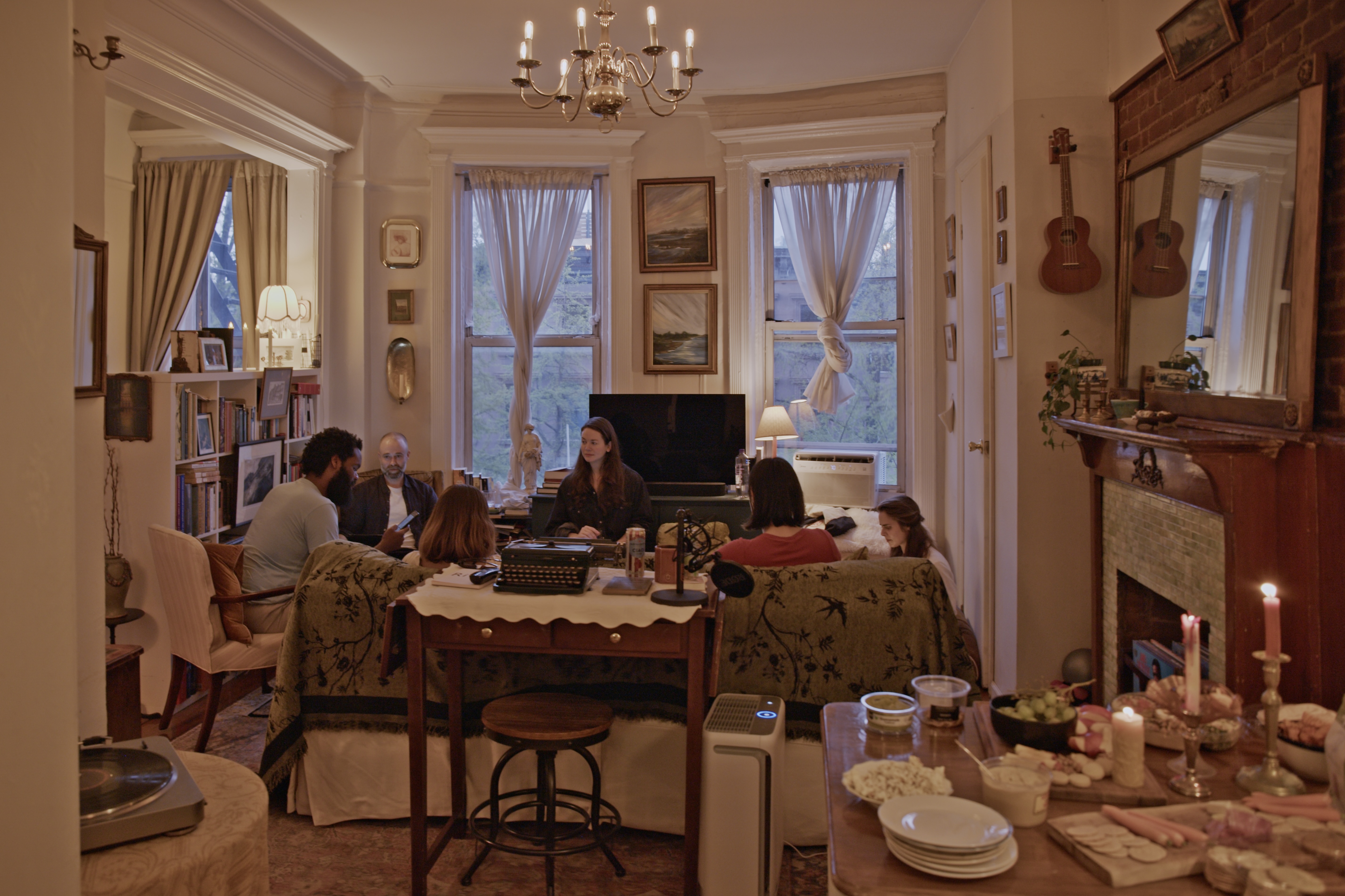 The first potluck took place in the summer of 2023. Ten or fifteen people in an apartment. A green tiled fireplace as the stage. Candles arranged as footlights. There was live music—composer Will Healy improvising while a short story in progress, written by Su Hendrickson, was read aloud. Original songs, play readings, live painting. Food everywhere.