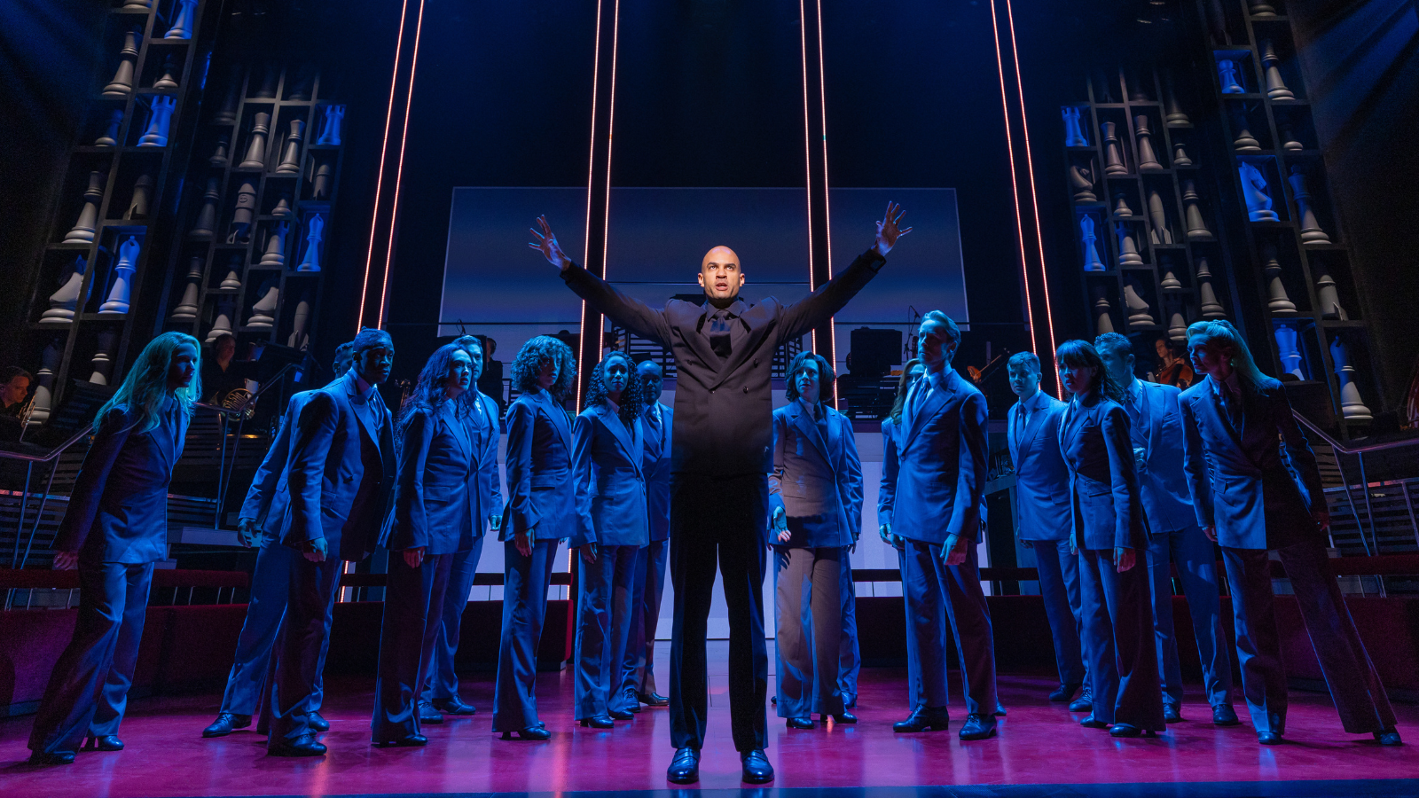 Perhaps a bit too powerful, as the score does occasionally drown out the voices of a hard-working ensemble. Those finely-suited dancers, looking stylish in elegant gray, make up for it with dazzling moves choreographed by the ever-reliable Lorin Latarro (The Who’s Tommy). So invigorating is the dancers’ muscular backing that it’s a real loss, if perhaps an inevitable one, when they recede into the background for much of act two.