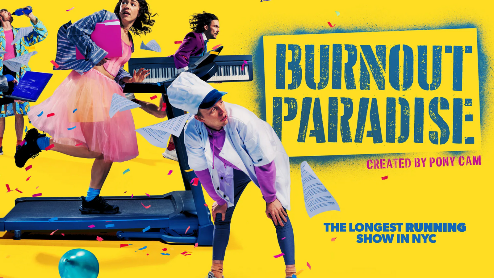 Five performers. Four treadmills. One chance to beat the clock. The theatrical phenomenon from award-winning Australian collective Pony Cam is taking Off-Broadway by storm. It’s a live show you’ll never forget, as the people onstage make a desperate attempt to complete a series of escalating tasks, like cooking a three-course meal and filling out a grant application... all while running on treadmills. And if they don’t complete their to-do list in one hour’s time? You can get your money back. Burnout Paradise is part comedy, part endurance feat, part theatrical explosion – but more than anything, it’s a euphoric, visceral celebration of our tendency to run full tilt towards life’s endless challenges.