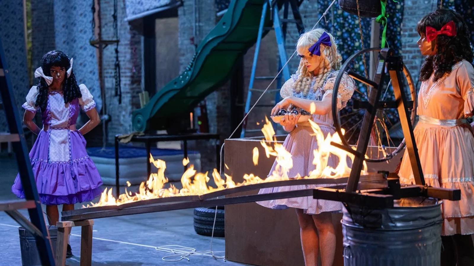 An elaborate Rube Goldberg machine fills every nook and cranny of NYU Skirball’s expansive stage. Three doll-like figures in creepy masks, pigtails and square-dancing dresses, emerge from a treehouse. They inspect the massive set-up with childlike wonder. Then. as a live musical score creeps in (played live by Holland Andrews), the three begin to wreak havoc.
